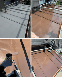 その上から中塗り・上塗りと重ね、屋根表面を保護しました。 塗膜が再び金属を覆うことで、雨水の侵入を防ぎ、 屋根の寿命をぐっと延ばすことができます。
